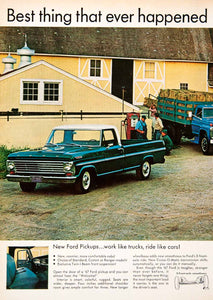This is an original 1967 two-page color print ad for pickup trucks from the Ford Company. Please see additional images.