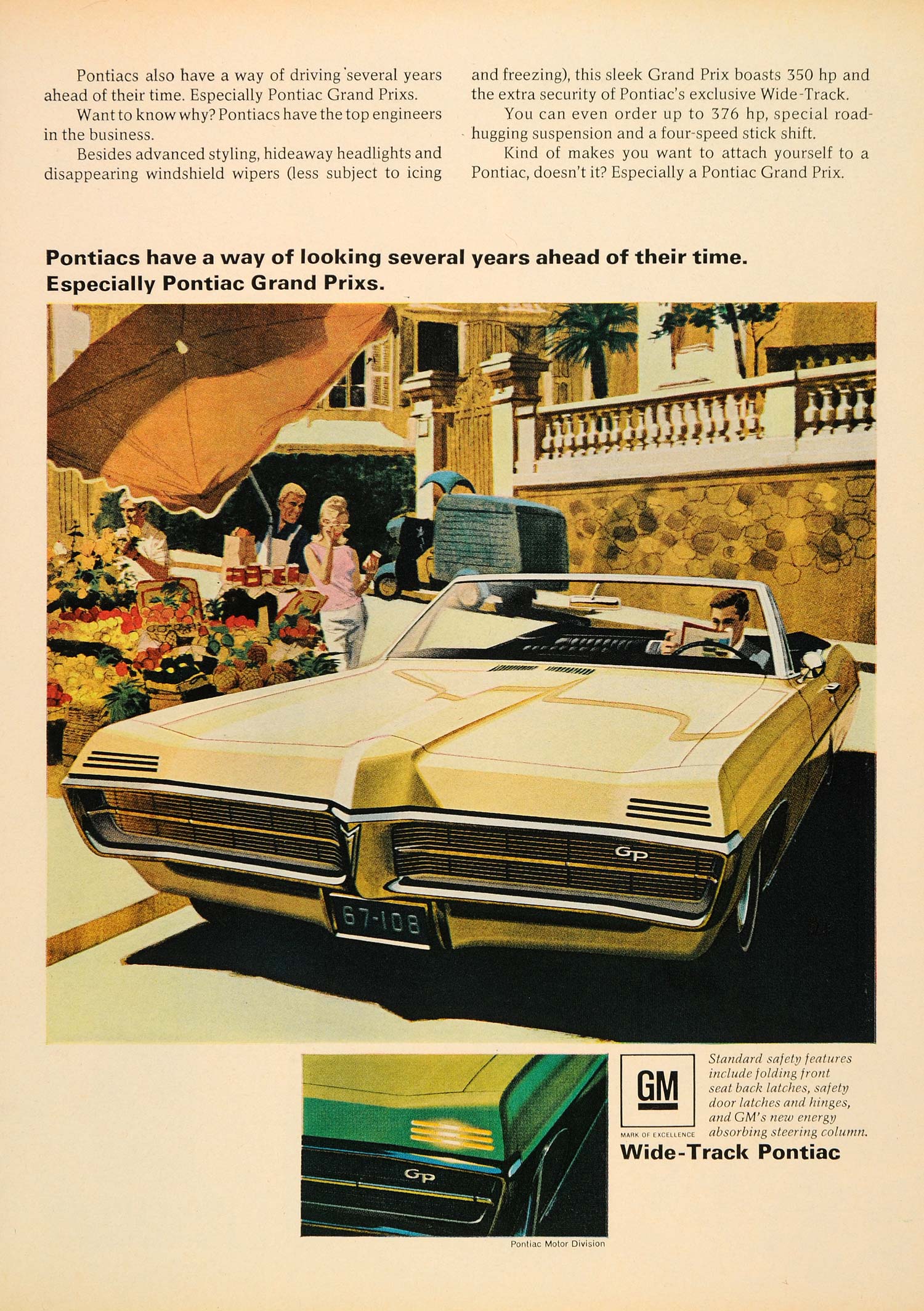 This is a stunning original 1967 color print ad for the Pontiac Grand Prixs automobile from Pontiac Motor Division of General Motors. This is an excellent original print item for the collector of this vintage car!