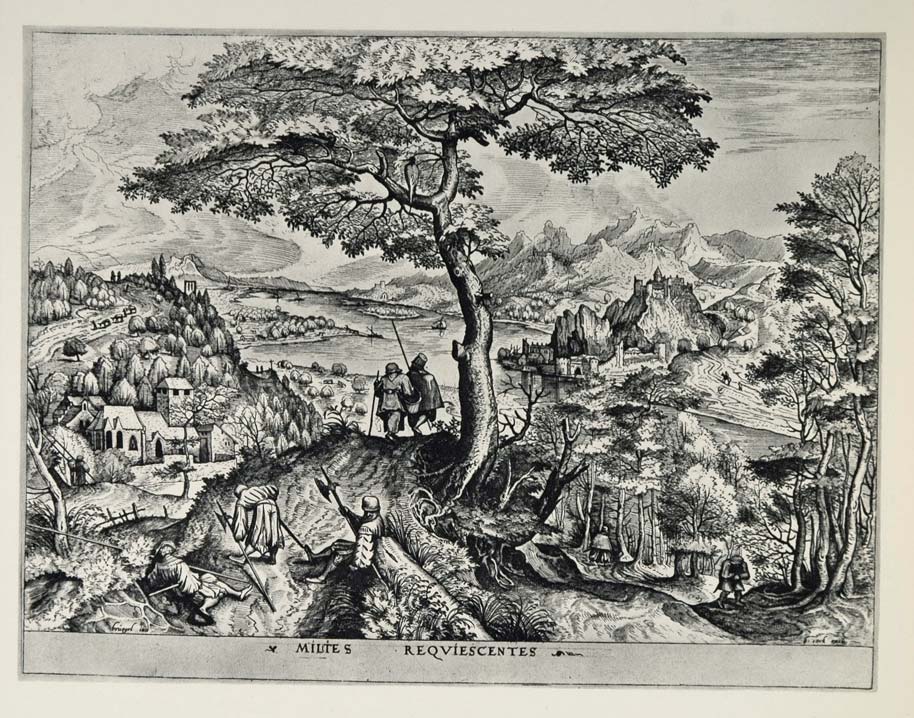 This is an original 1967 print of a landscape etching by Pieter Bruegel the Elder, (c. 1529-1569).
