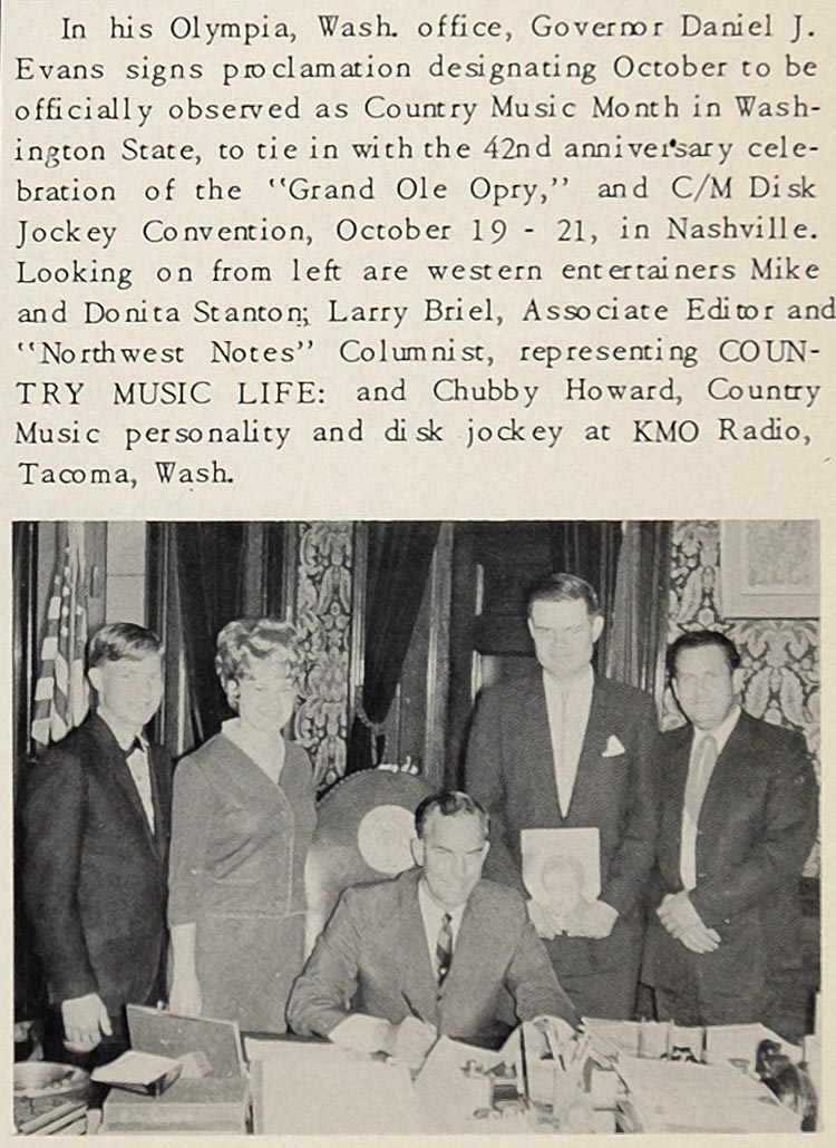 This is an original 1967 halftone print of Governor Daniel J. Evans signing the proclamation designating October to be officially observed as Country Music Month in the State of Washington. Looking on are Mike and Donita Stanton, Larry Briel, and Chubby Howard.