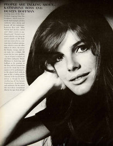 This is an original 1967 two-page black and white halftone print (two single-sided pages) of Dustin Hoffman and Katharine Ross, the stars of the Mike Nichols 1967 movie classic "The Graduate." Please see both images.