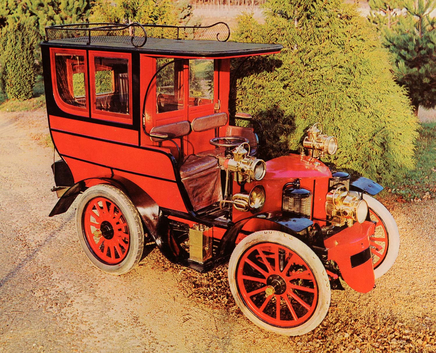 This is an original 1968 color print of an antique 1901 horizontal two cylinder Amedee-Bollée Limousine with chain transmission and body by Gaudichet and Turquest of Le Mans.