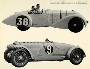 This is an original 1968 duotone halftone print of the Riley One Point Five (1.5), which had been retired in 1937. The lower image is the Villeneuve-Vagniez Delehaye, a sister-car to the second-place finisher.