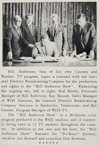 This is an original 1968 halftone print of country music artist Bill Anderson singing a contract with the General Electric Broadcasting Company for the production and rights to the "Bill Anderson Show." Pictured here are Bud Brown; Bill Anderson; Ray Shouse, Sales Manager of WSIX Stations; and Hall Greene, Program Manager of WSIX-TV, Nashville.