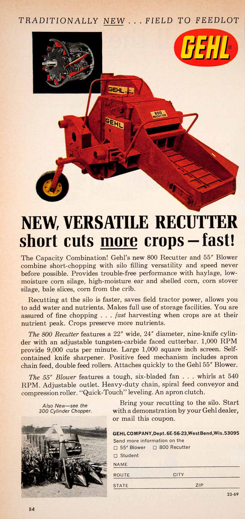 This is an original 1969 color print ad for the 800 Recruiter, a product by the Gehl Company of West Bend, Wisconsin.
