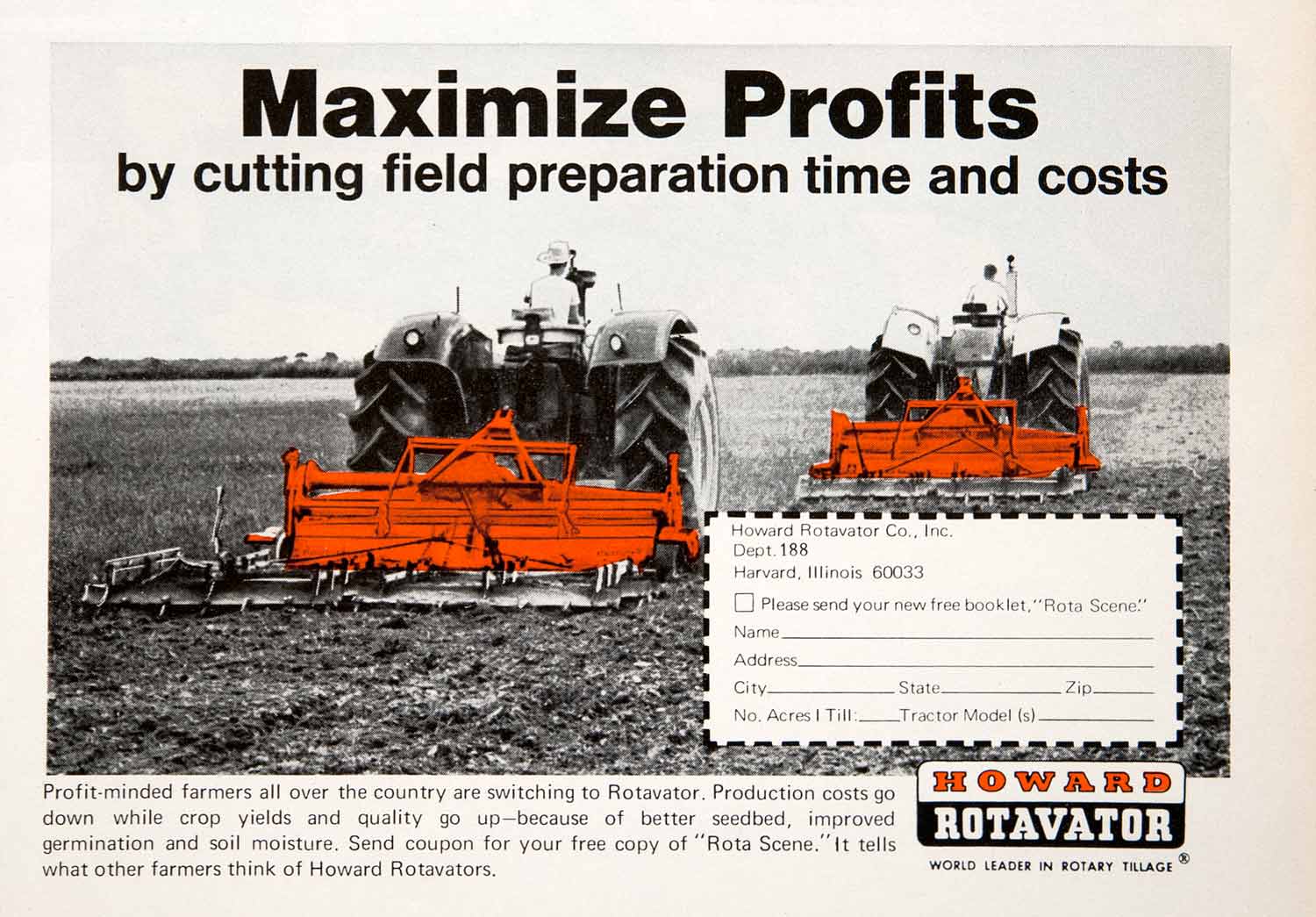 This is an original 1969 two-color print ad for rotary tillage equipment by the Howard Rotavator Company Inc. of Harvard, Illinois.