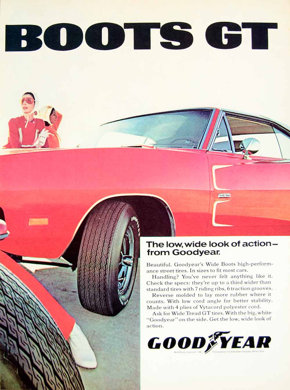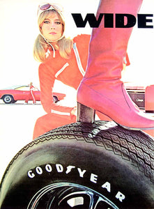 This is an original 1969 two-page color print ad for Goodyear Wide Boots high performance street tires. Please see both images.