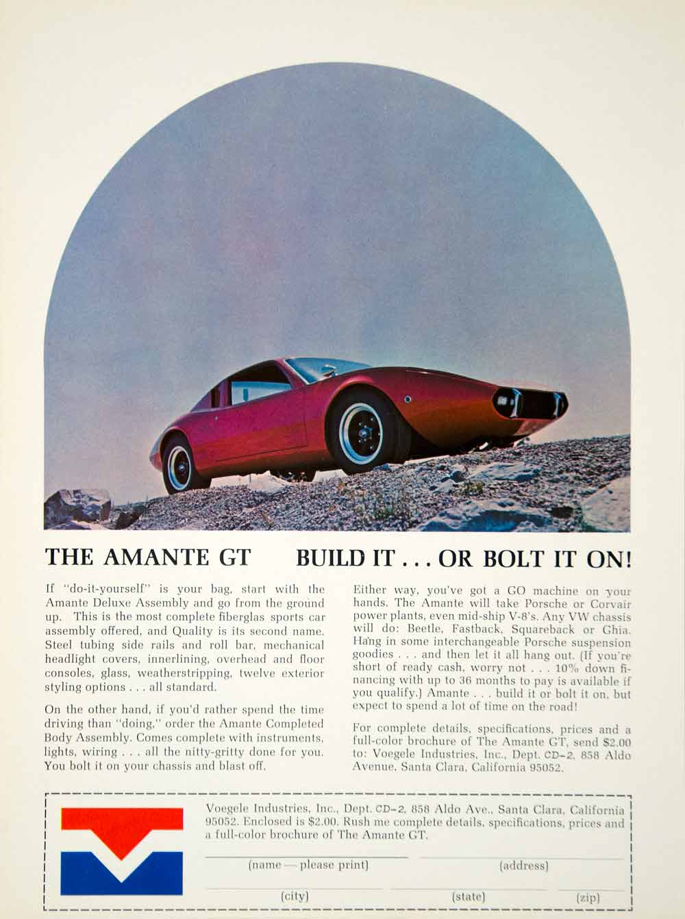 Keywords specific to this image: Vintage Advertising, Auto, Automotive, Automobile, Motor, Vehicle, Exterior Styling, Pre-Assembled, 2-Door, Coupe, Red, Steel Tubing, Side Rails, Volkswagen Chassis, Roll Bar, Voegele Industries, 858 Aldo Avenue Santa Clara California CA, Ave, Parts, Accessories