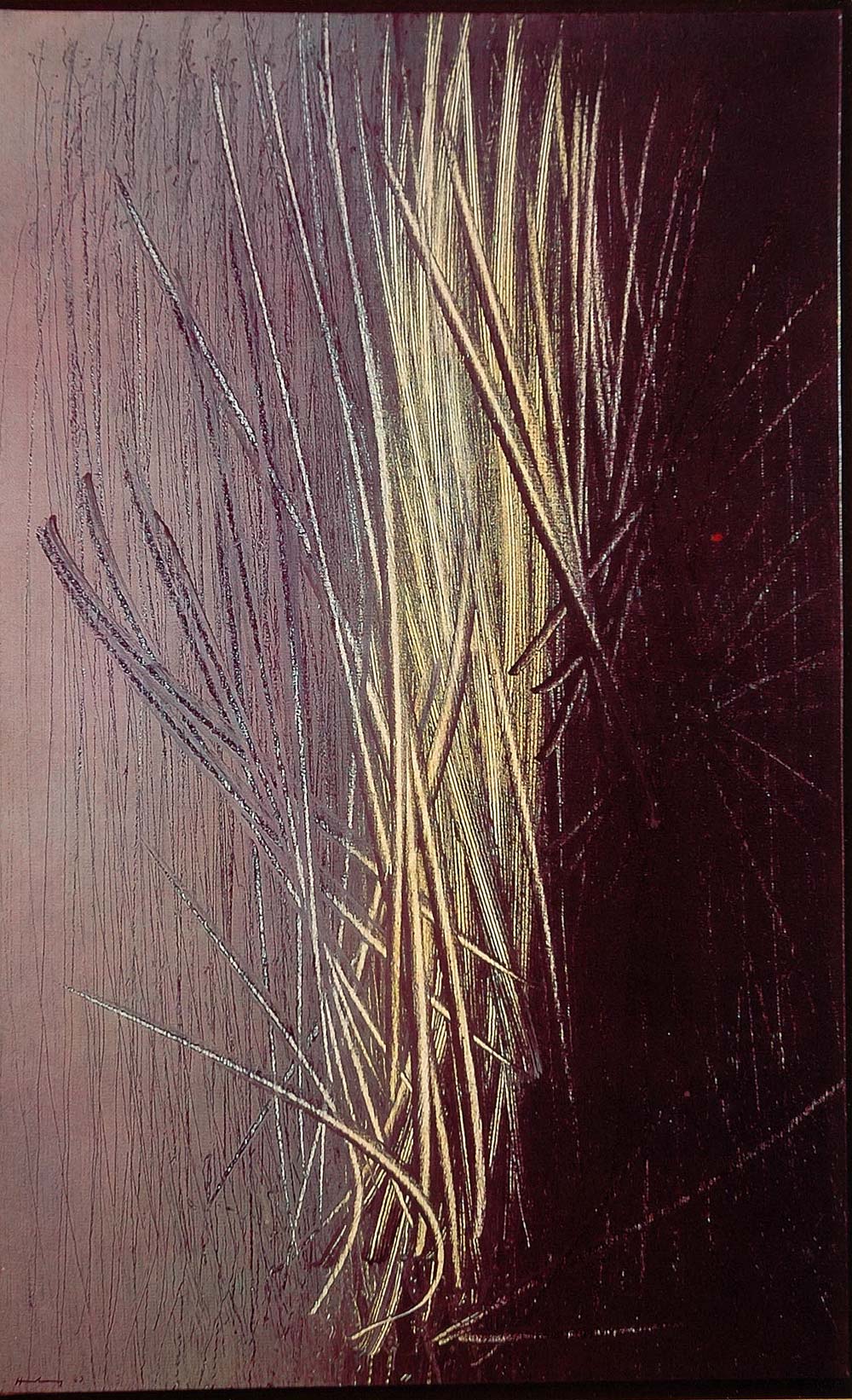 This is an original 1970 color print of a work by German Pop artist, Hans Hartung. The print measures 6 x 9.75 inches, and it is tipped-in on a brown mounting board which measures approx. 8 x 11.5 inches. Included with this item is an image of the artist which is printed with black ink on clear acetate. This image measures 8 x 9 inches on a sheet of clear acetate which measures approx. 8 x 11.5 inches. (Please note that in order to see this image clearly we have shot it against a white background. Framed on a white board this image would appear as it does in our digital image.) Please see both images.