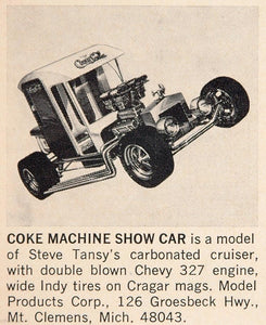 This is an original 1970 black and white print ad for the Coke Machine Show Car, a model of Steve Tansy's carbonated cruiser with a double blown Chevy 327 engine and wide Indy tires on Cragar mags, from the Model Products Corp., 126 Groesbeck Hwy., Mt. Clemens, MI.