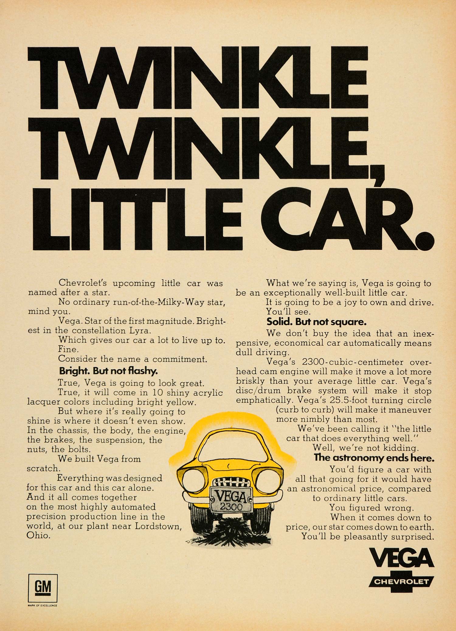 This is an original 1970 color print ad for the Chevrolet Vega 2300 automobile from Chevrolet Division of General Motors located in Detroit, Michigan.