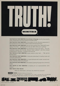 This is an original 1970 black and white print ad for Minitrix N Gauge Model Train Sets from Trix Trains, Division of American Tortoise Inc., 180 Smith St., Farmingdale, NY.