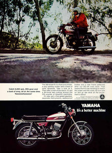 This is an original 1970 color print ad for the 1970 Yamaha RD350 "R-5" classic motorcycle that was made and sold by the Yamaha International Corporation.