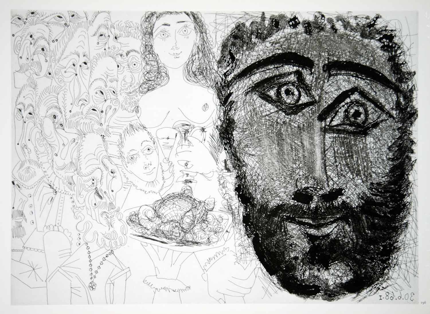 This is an original 1970 black and white heliogravure of a 1968 aquatint, dry point by Pablo Picasso.