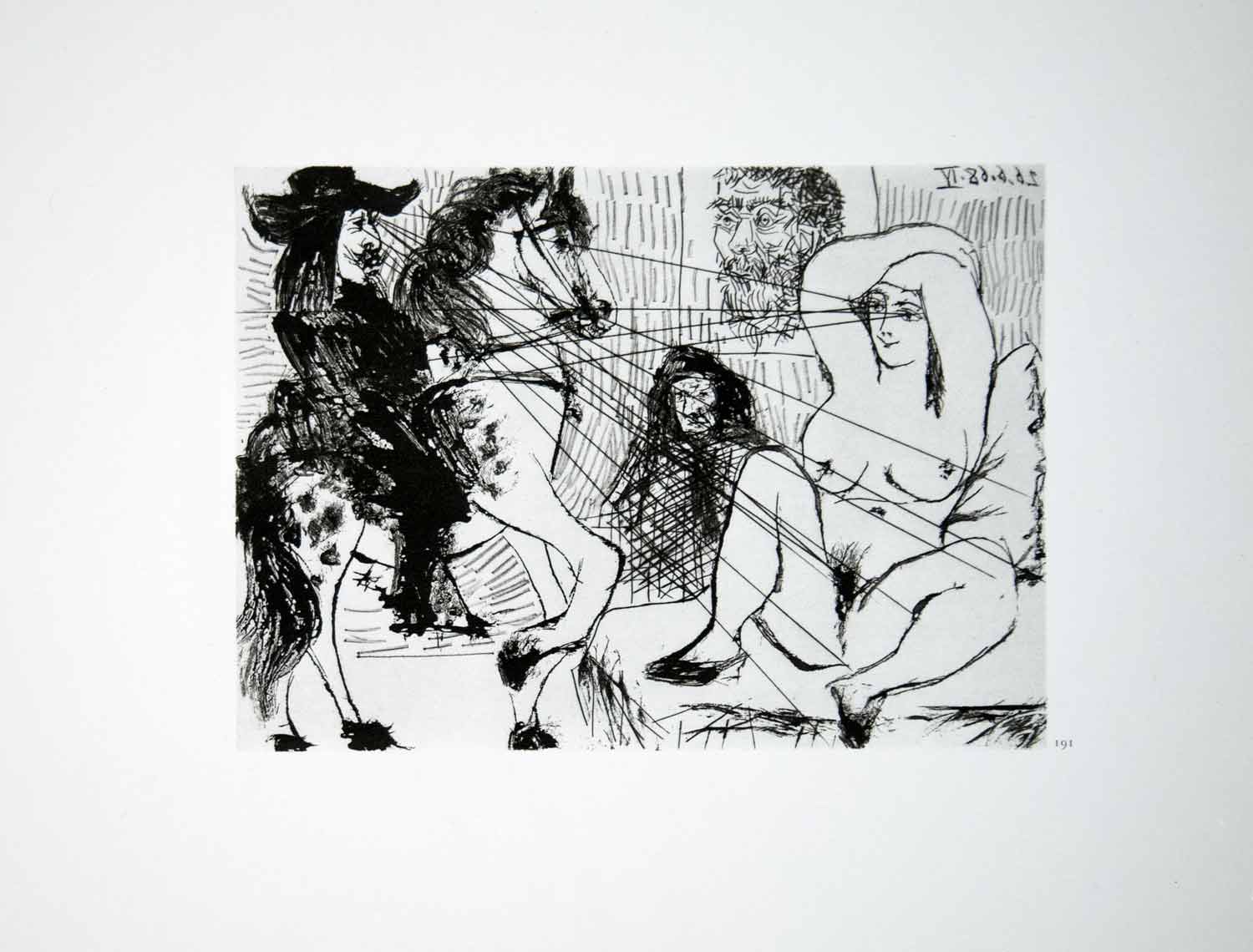 This is an original 1970 black and white heliogravure of a 1968 aquatint, dry point by Pablo Picasso.