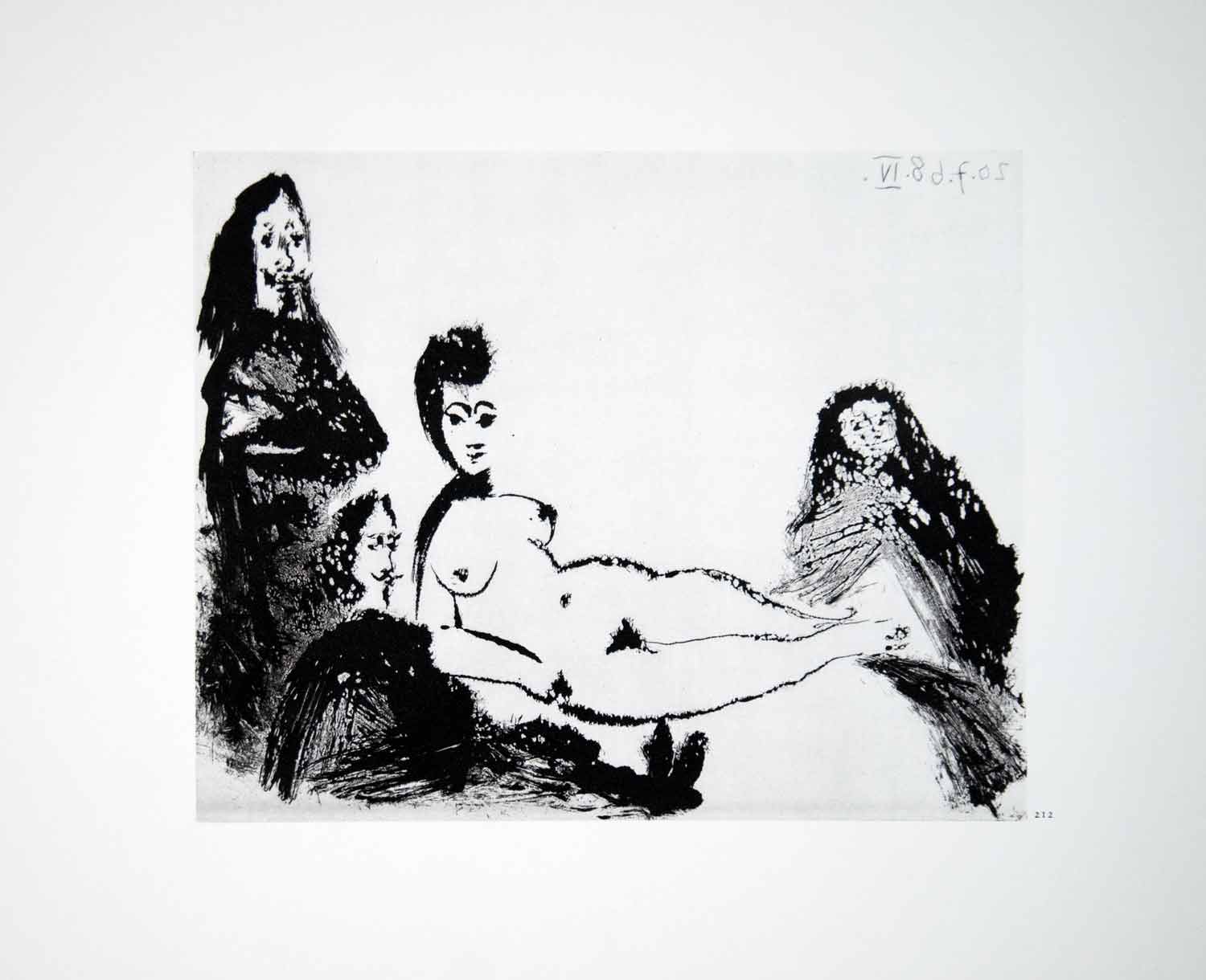 This is an original 1970 black and white heliogravure of a 1968 aquatint by Pablo Picasso.