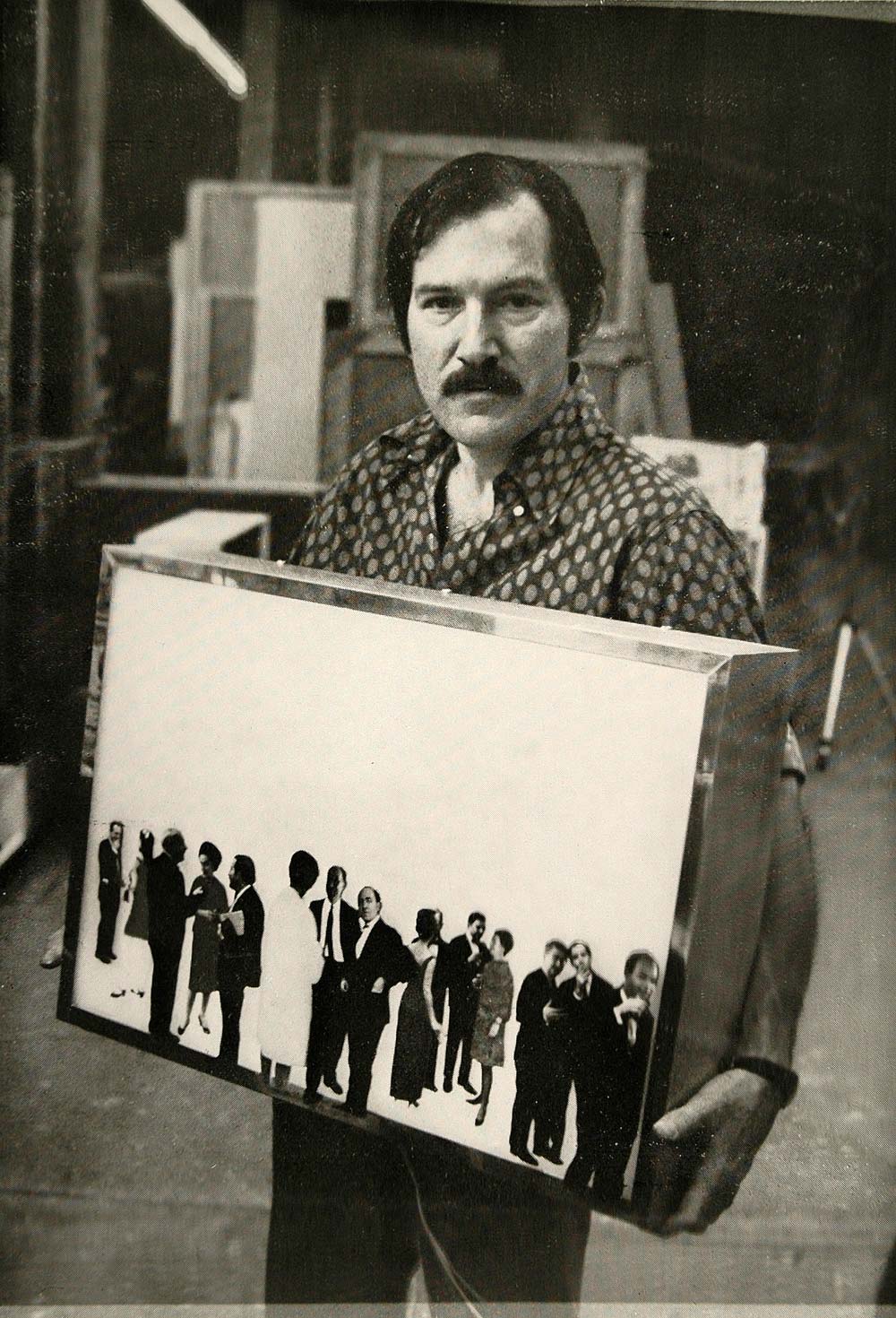 This is an original 1970 color print of a work by American Pop artist, Howard Kanovitz. The print measures 4.75 x 6.75 inches, and it is tipped-in on a brown mounting board which measures approx. 8 x 11.5 inches. Included with this item is an image of the artist which is printed with black ink on clear acetate which measures approx. 8 x 11.5 inches. (Please note that in order to see this image clearly we have shot it against a white background. Framed on a white board this image would appear as it does in our digital image.) Please see both images.