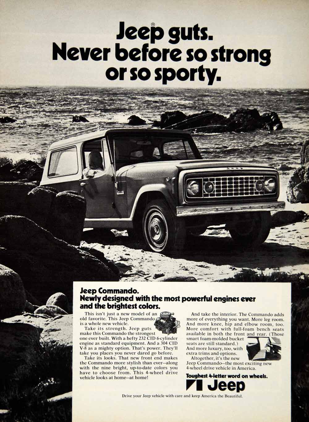 Keywords specific to this image: Vintage Advertising, Auto, Automotive, Classic, Motor, Vehicle, Transportation, Machine, Mechanical, Sport Utility Vehicle, American, Domestic, Sea, Rocks, Coast, Sand, 232 CID V6 Engine, 304 CID V8, 4WD
