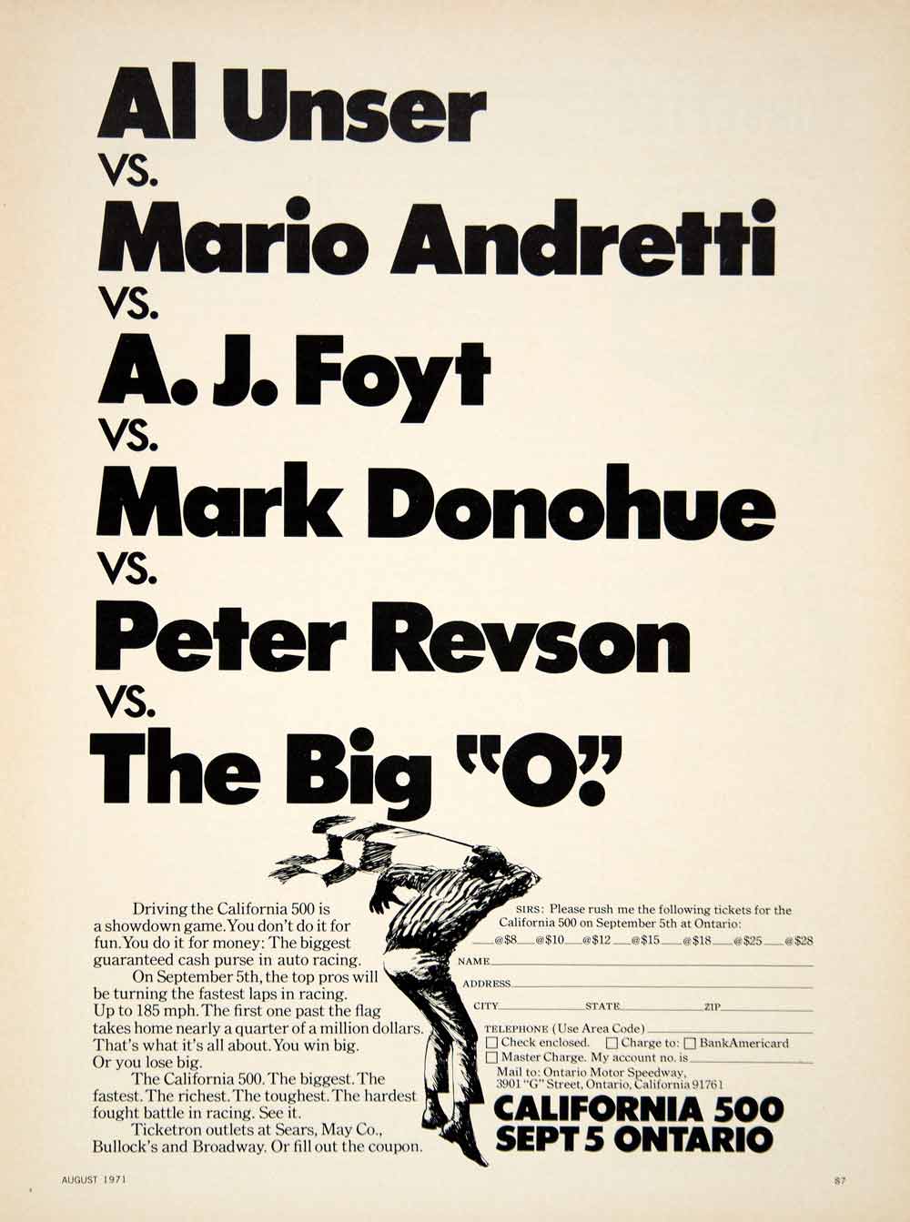 Keywords specific to this image: Vintage Advertising, Automobile, Automotive, Race, Driver, Motorsport, Track, Sports, Course, Event, Street, CA, Al Unser, Mario Andretti, A.J. Foyt, Mark Donohue, Peter Revson, Checkered Flag