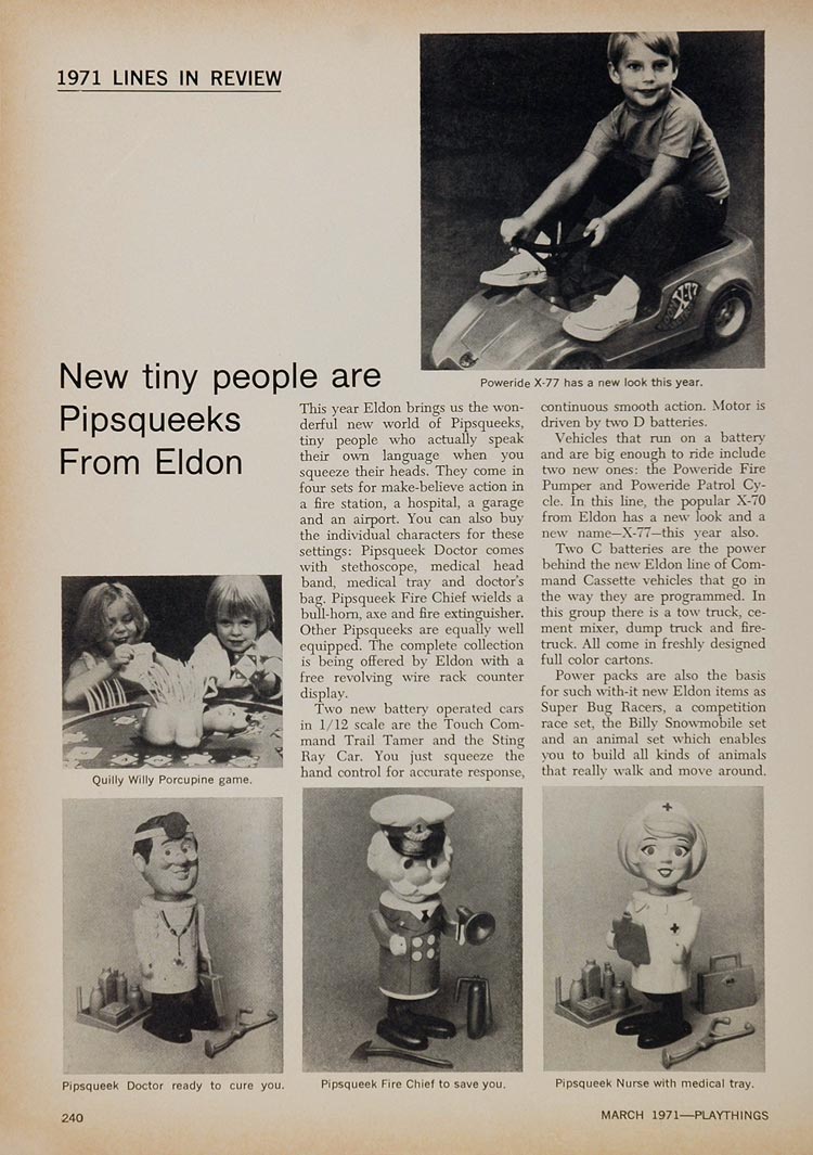 This is an original 1971 black and white print ad with a short article on Eldon toys. The toys featured include the Quilly Willy Porcupine game, the Poweride X-77, and the Pipsqueek Doctor, Fire Chief, and Nurse.