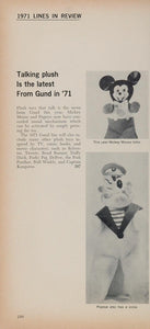 This is an original 1971 black and white print ad for talking plush toys from Gund. Shown here are Mickey Mouse and Popeye. The Gund line of talking toys also includes TV, Movie and comic characters such as Sylvester, Tweety, Road Runner, Daffy Duck, Porky Pig, DePew, the Pink Panther, Bull Winkle, and Captain Kangaroo.