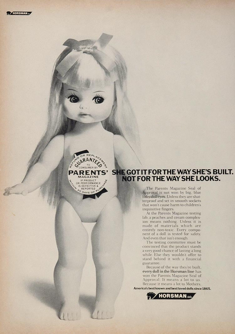 This is an original 1971 black and white print ad for Horsman dolls which won the