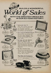 This is an original 1971 black and white print ad for toys from The Ohio Art Company of Bryan, Ohio. The featured toys include the Spring Twins, Dial to Learn, School Days, Etch A Sketch, Bizzy Buzz Buzz, Twirl O Paint, and the Ding Dong Train.