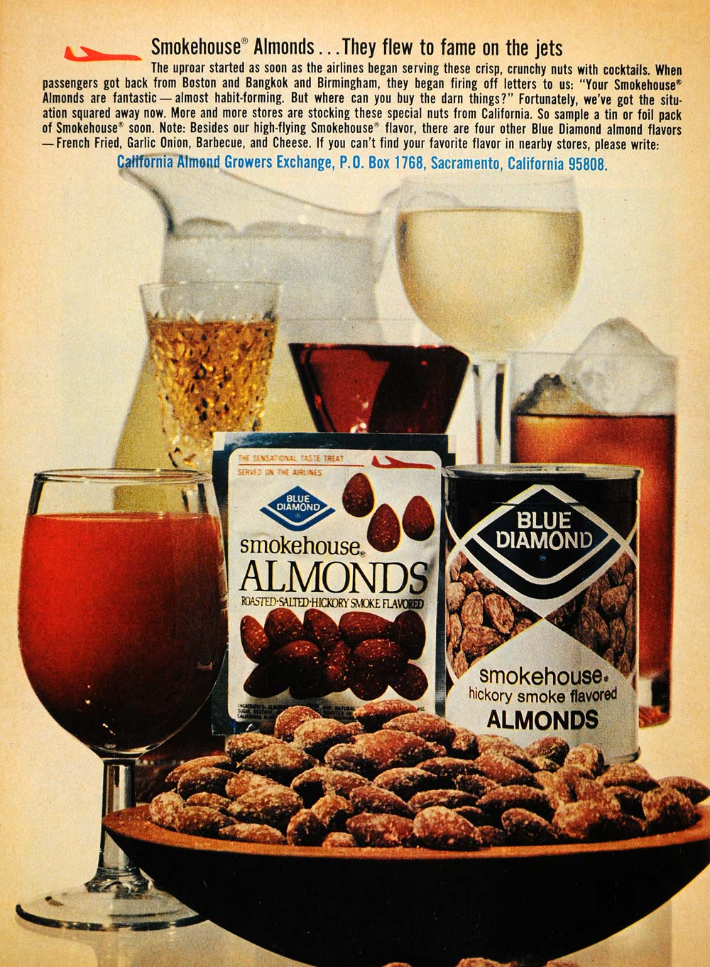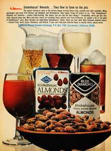 This is an original 1971 color print ad for Smokehouse Almonds, made popular served with cocktails on airplanes. The California Almond Growers Exchange is located in Sacramento, California.