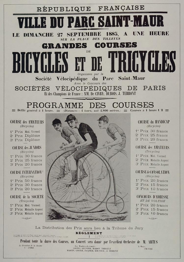 This is a 1973 reproduction of a black and white poster that was created in 1885 to advertise the French Ville du Parc Saint-Maur Bicycle and Tricycle Races on 27 September, 1885. The print has an awesome illustration of the early "ordinary" or "high-wheeler" bicycles.