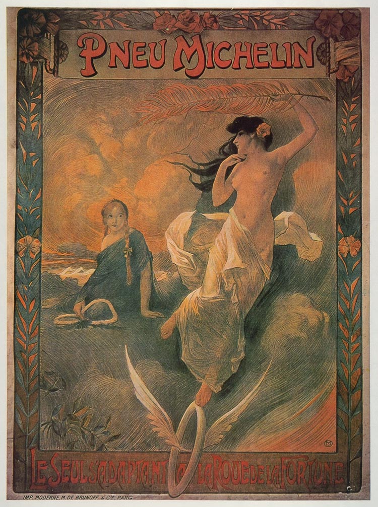 This is a 1973 color reproduction of a French poster that was created circa 1905 to advertise Michelin Tires.
