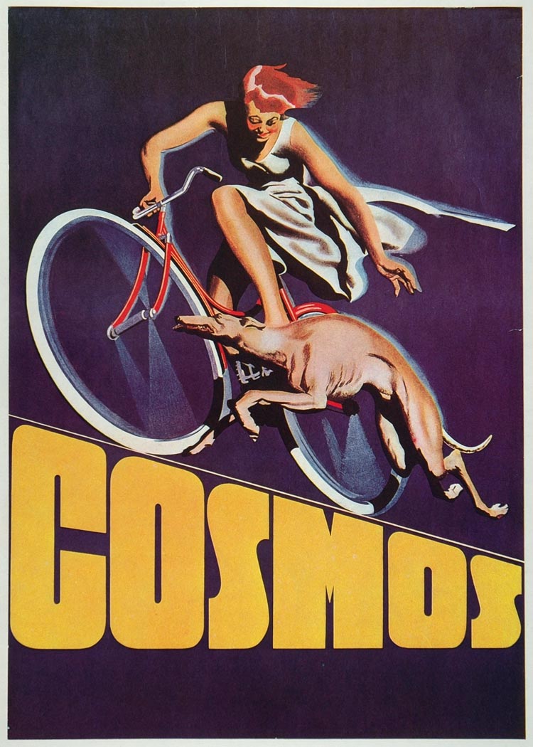 This is a 1973 color reproduction of a dynamic poster that was created in 1935 to advertise Cosmos Bicycles, manufactured by B. Schild & Cie. AG of Biel, Switzerland.