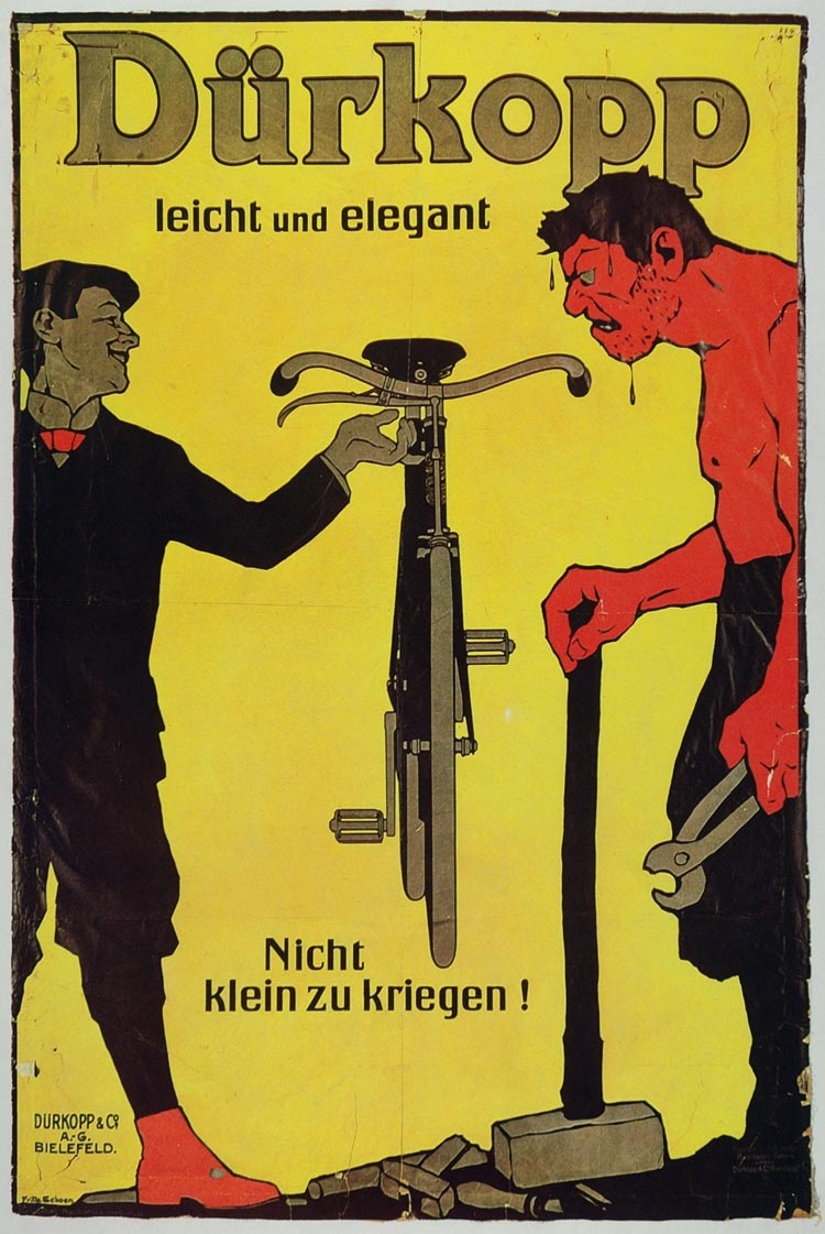 This is a 1973 color reproduction of a poster that was created in 1910 by artist Fritz Schoen to advertise Dürkopp Bicycles.