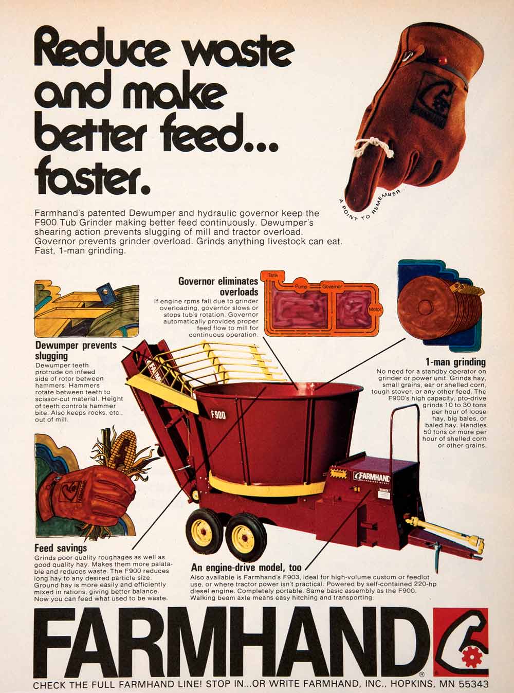 This is an original 1975 color print ad for various farming implements from the Farmhand Incorporation of Hopkins, Minnesota.