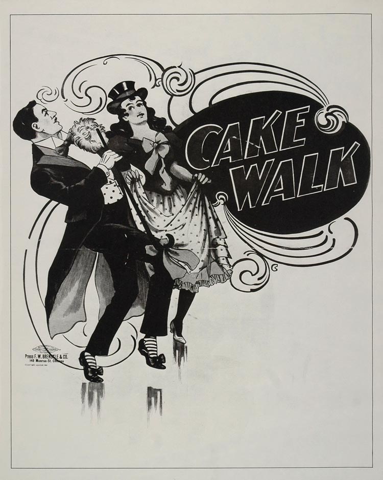 This is a 1975 black and white reproduction of a color poster that was created in 1898 for a Cake Walk or Cakewalk--a traditional African-American strutting dance--also popular in vaudeville and minstrel shows in the late 19th and early 20th century.