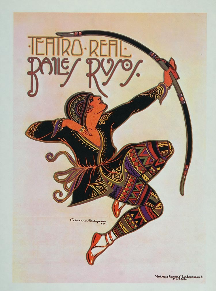 This is a 1975 color reproduction of a poster that was created in 1921 by the artist Abelard Delgado for Balies Rusos--Teatro Real.