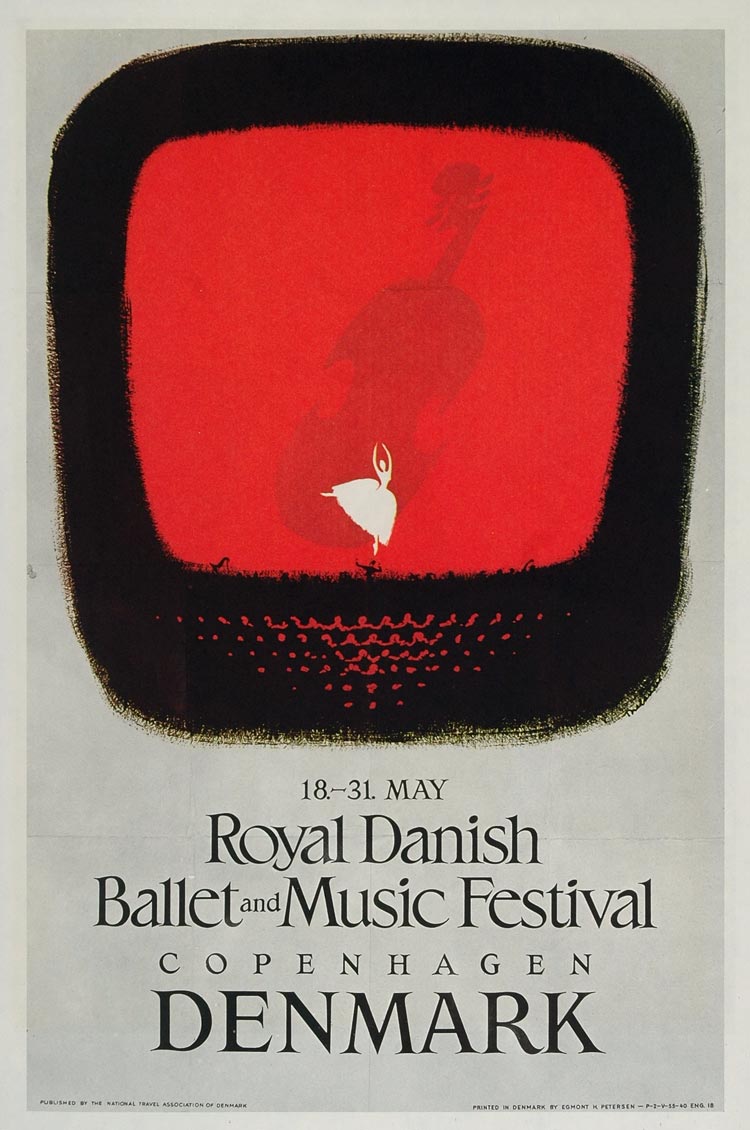 This is a 1975 color reproduction of a poster that was created in 1955 for the Royal Danish Ballet and Music Festival, 18-31 May, 1955.