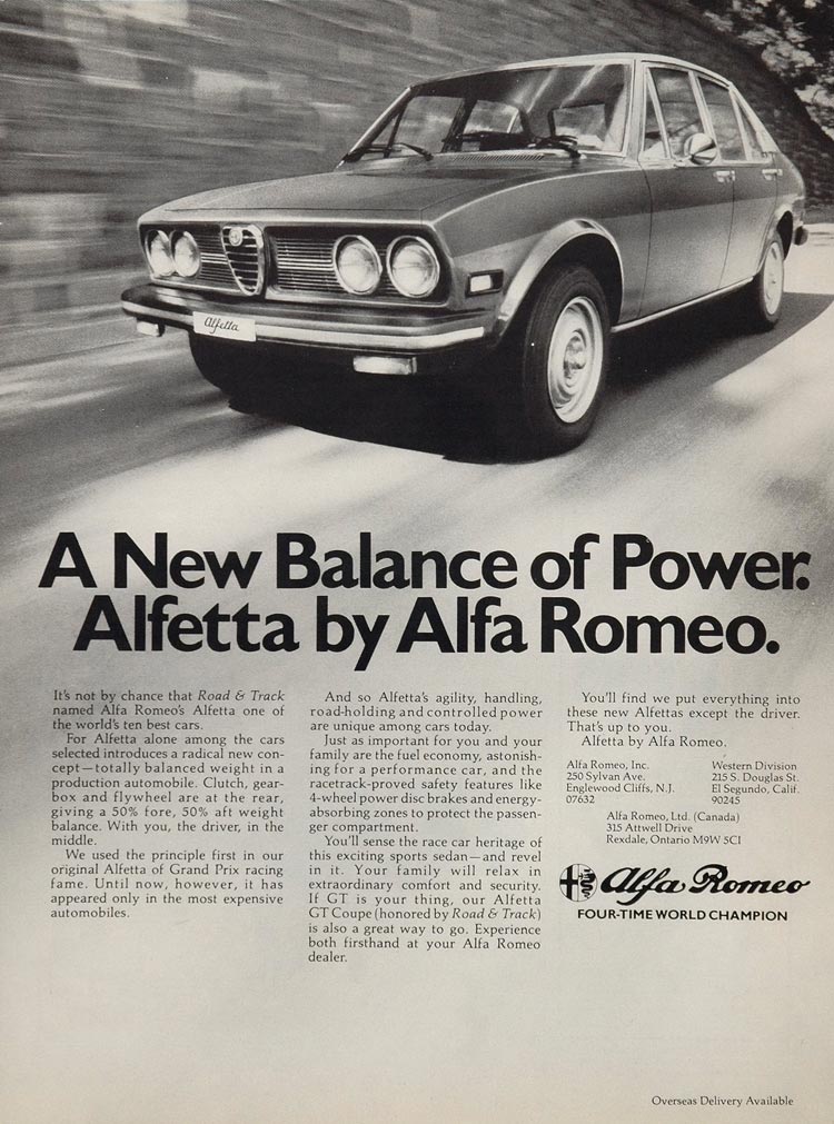 This is an original 1976 ad for the Alfa Romeo Alfetta, named by Road & Track as one of the world's ten best cars.