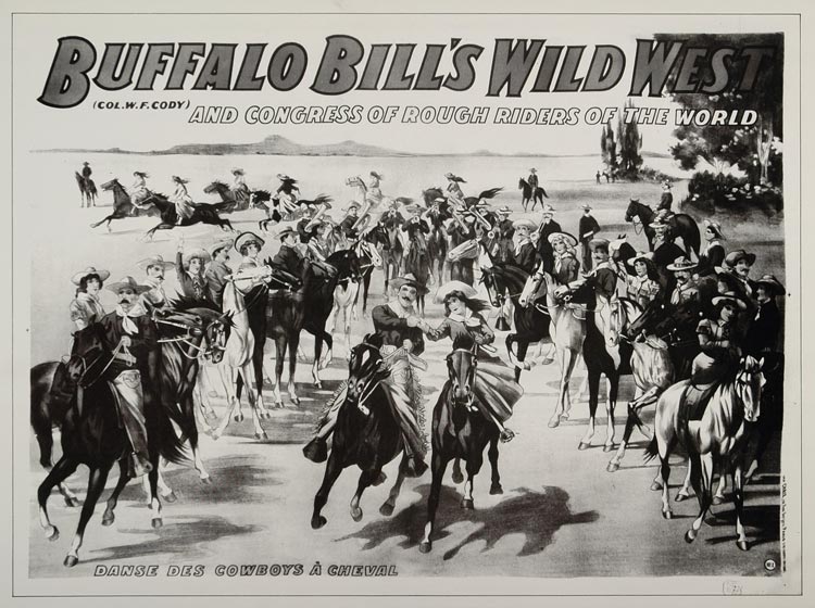 This is a 1976 black and white reproduction of a poster that was created in 1905 to advertise the French tour of Buffalo Bill's Wild West and Congress of Rough Riders of the World. The image is of cowboys doing the Virginia Reel on horseback.