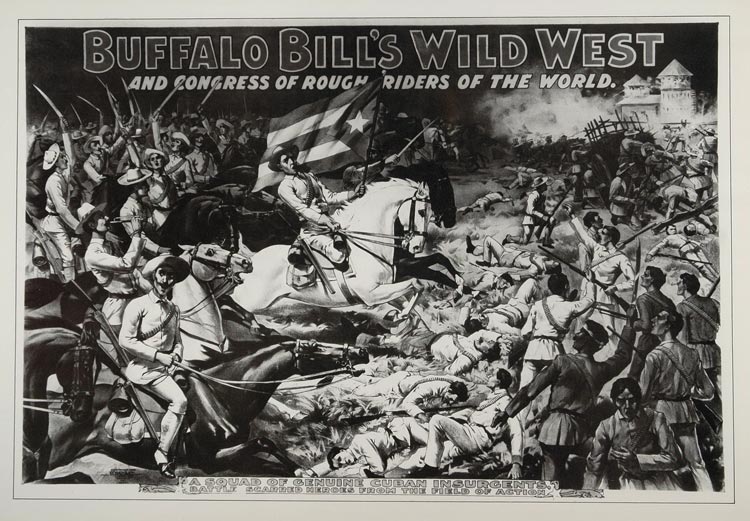 This is a 1976 black and white reproduction of a poster that was created in 1898 to advertise Buffalo Bill's Wild West show which featured a squad of "Genuine Cuban Insurgents--battle scarred heros from the field of action" of the Spanish-American War.