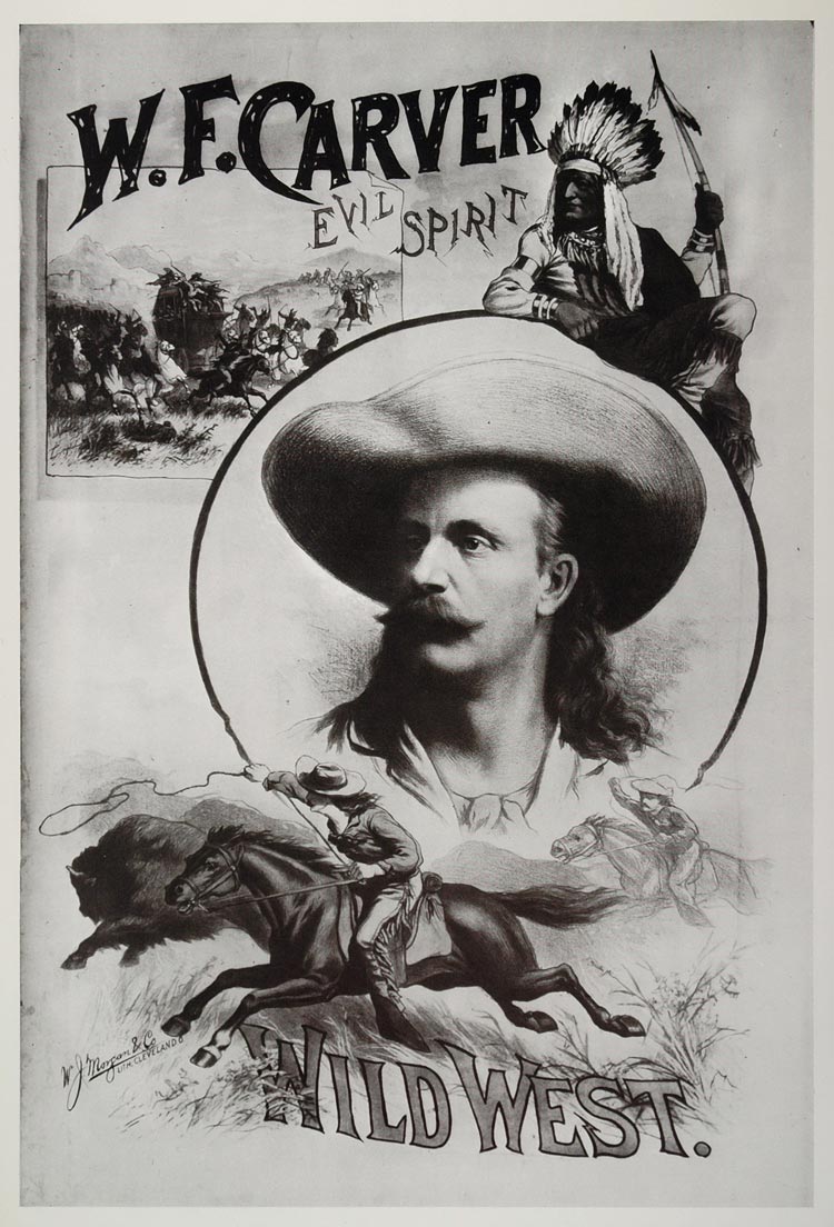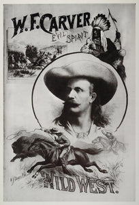 This is a 1976 black and white reproduction of a color poster that was created in 1885 to advertise W. F. Carver's Wild West. William Franklin Carver, "Evil Spirit," was a one-time partner of Buffalo Bill.