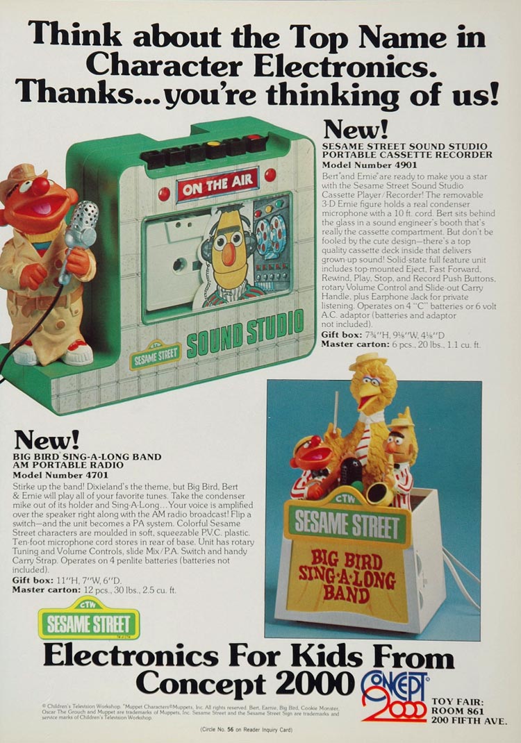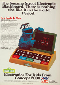 This is an original 1977 double-page, color print ad for electronic toys for preschool children from Concept 2000, including the Sesame Street Sound Studio Portable Cassette Recorder, Big Bird Sing-A-Long Band AM Portable Radio, and the Sesame Street Electronic Blackboard. An excellent original print ad for the collector of Sesame Street memorabilia! Please see both images.