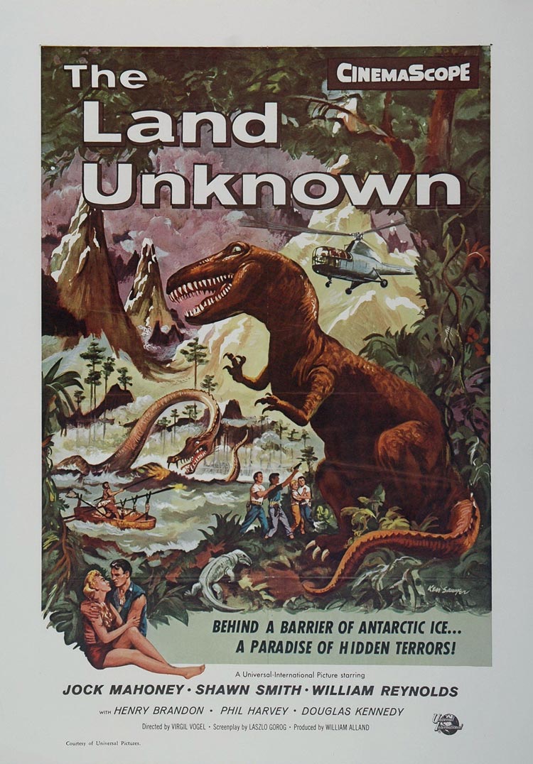 This is an original 1977 color print of a 1957 movie poster for The Land Unknown from a story by Charles Palmer and starring Jock Mahoney, Shirley Patterson, William Reynolds, Henry Brandon, Douglas Kennedy and Phil Harvey. The movie was directed by Virgil W. Vogel with screenplay by L‡szl— Gšršg.