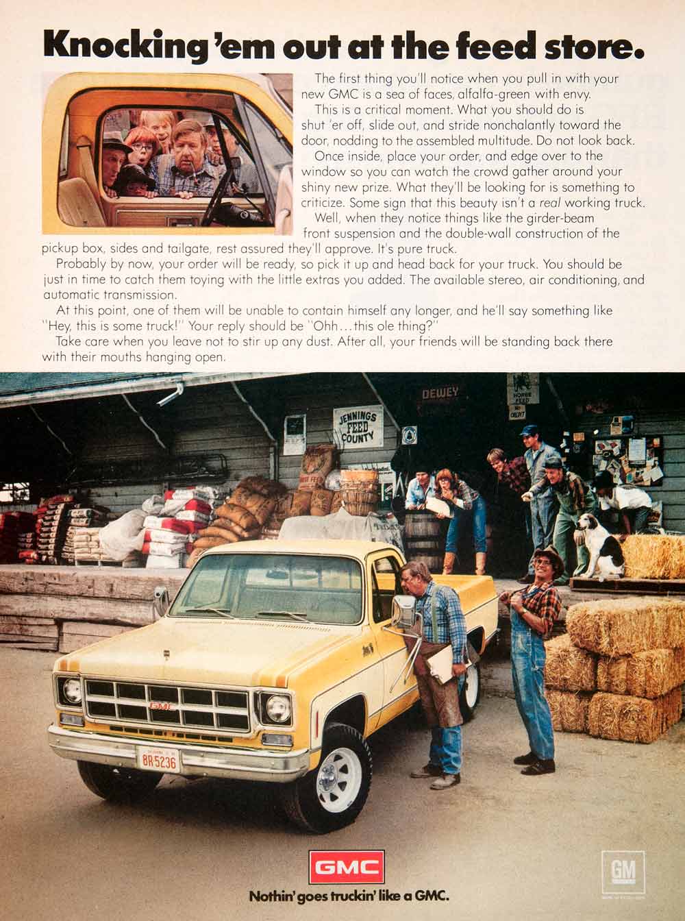 This is an original 1978 color print ad for pickup trucks from the General Motors Corporation. The illustration offers an image of various farmers standing around a truck at the feed store in Jennings County, in what we assume to be Indiana.
