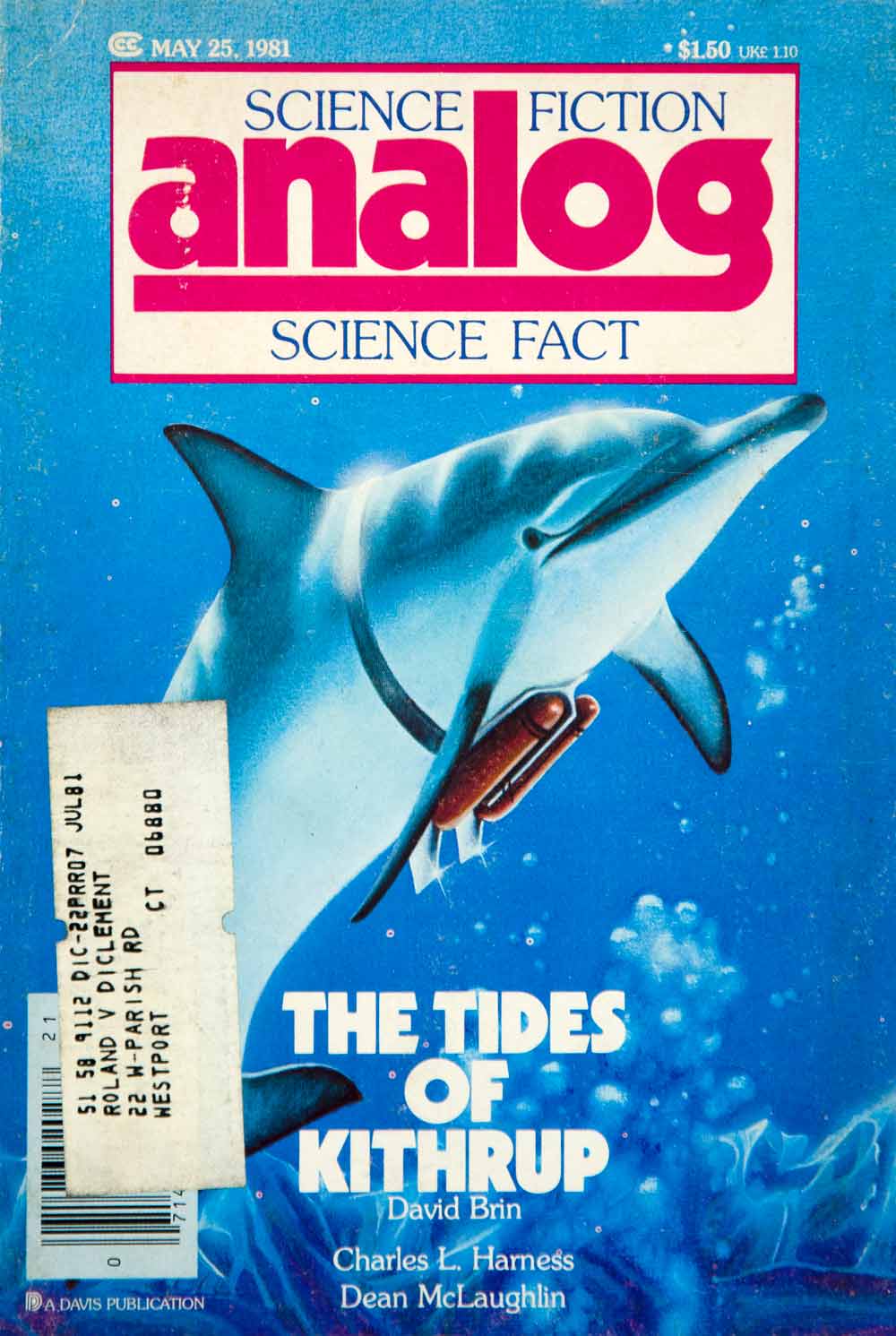 This is an original color cover for Analog Science Fiction, Science Fact, May, 1981 that featured artwork of an "uplifted" dolphin that was inspired by author David Brin's, The Tides of Kithrup.