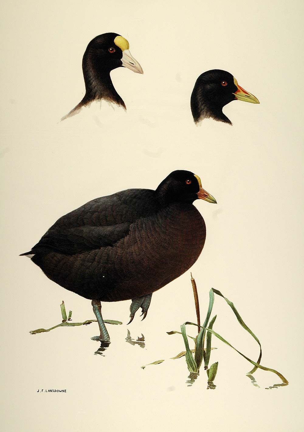 This is an original 1984 color print of three rails: the Andean Coot (head only, upper left), found from Ecuador to Tierra del Fuego; the Redgartered Coot (head only, upper right), found near lakes and ponds in southern South America; and the Whitewinged Coot (bottom), found in southern South America.