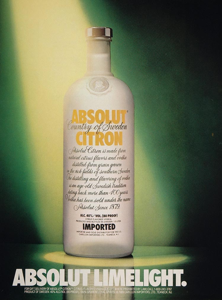 This is an original 1989 color print ad for Absolut Citron Vodka.