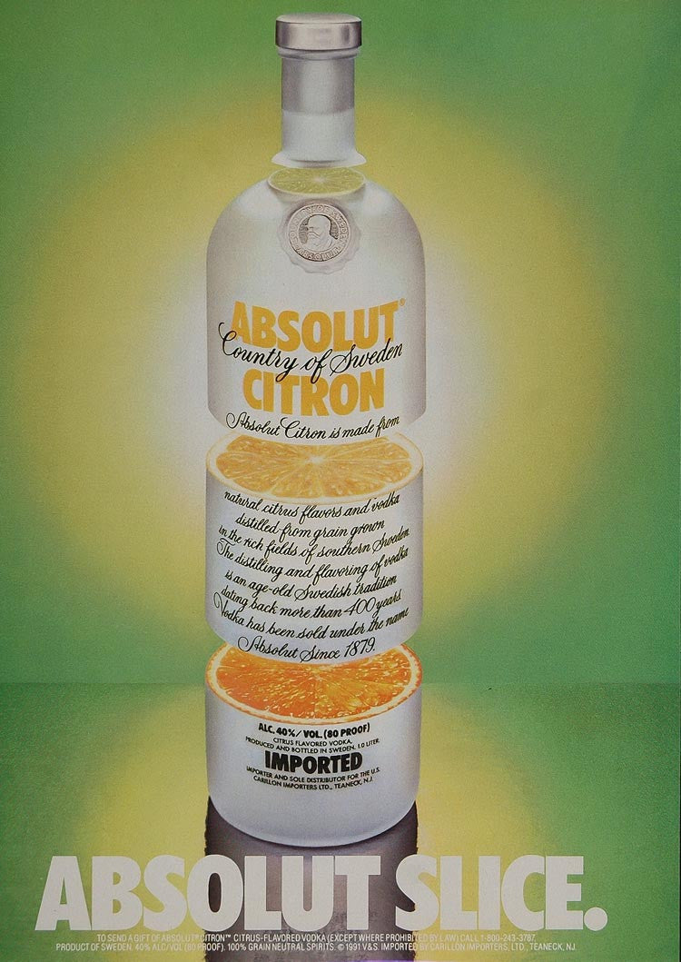 This is an original 1991 color print ad for Absolut Citron Vodka.