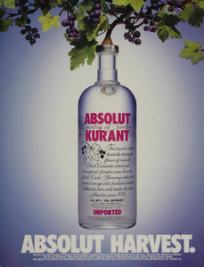 This is an original 1993 color print ad for Absolut Kurant Vodka. It is a nice image of a bottle hanging from a grape vine.
