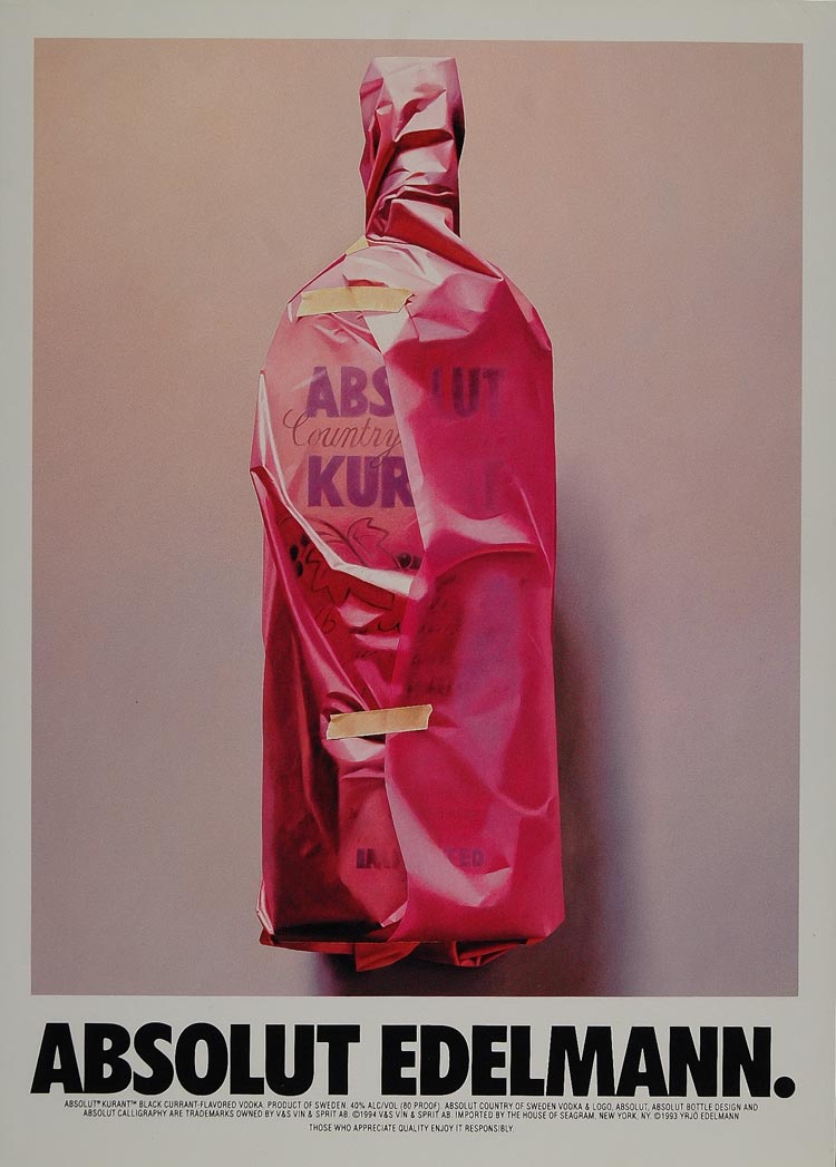 This is an original 1994 color print ad for Absolut Kurant Vodka. The ad was designed by Yrjo Edelmann.