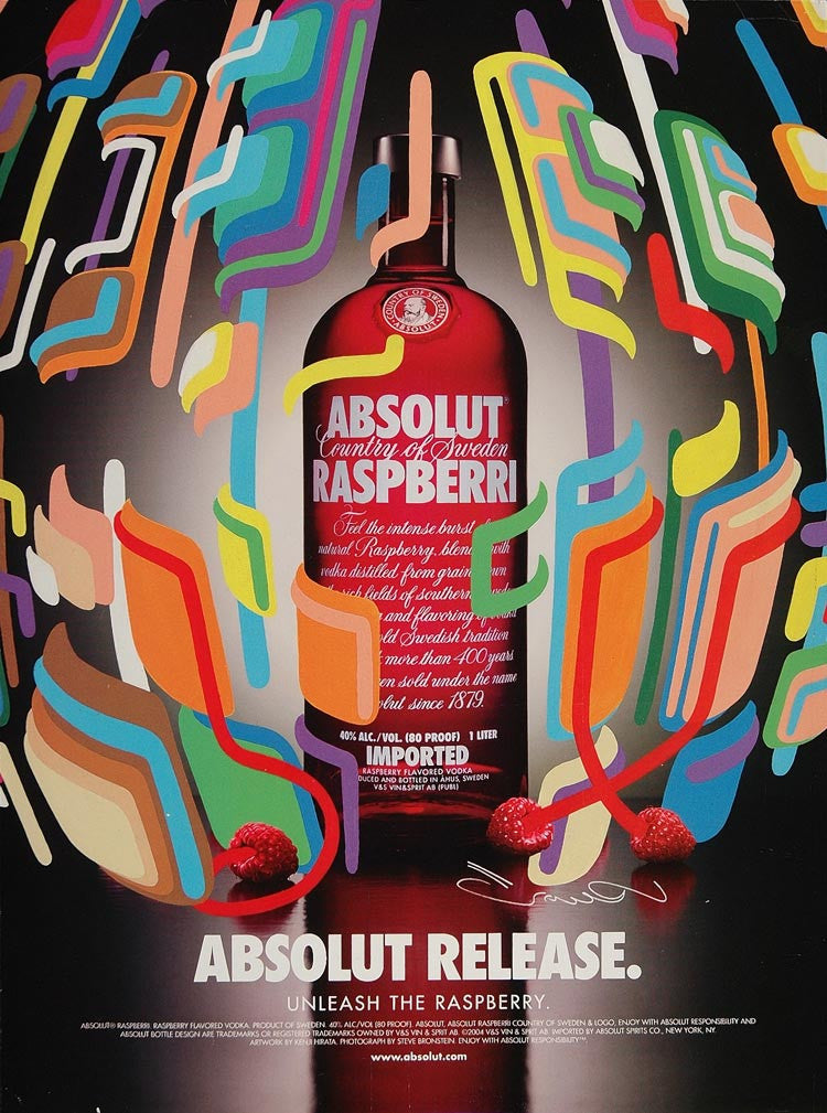 This is an original 2004 color print ad for Absolut Raspberri Vodka. The ad has a very bold, contemporary and graphic background. Photography by Steve Bronstein.